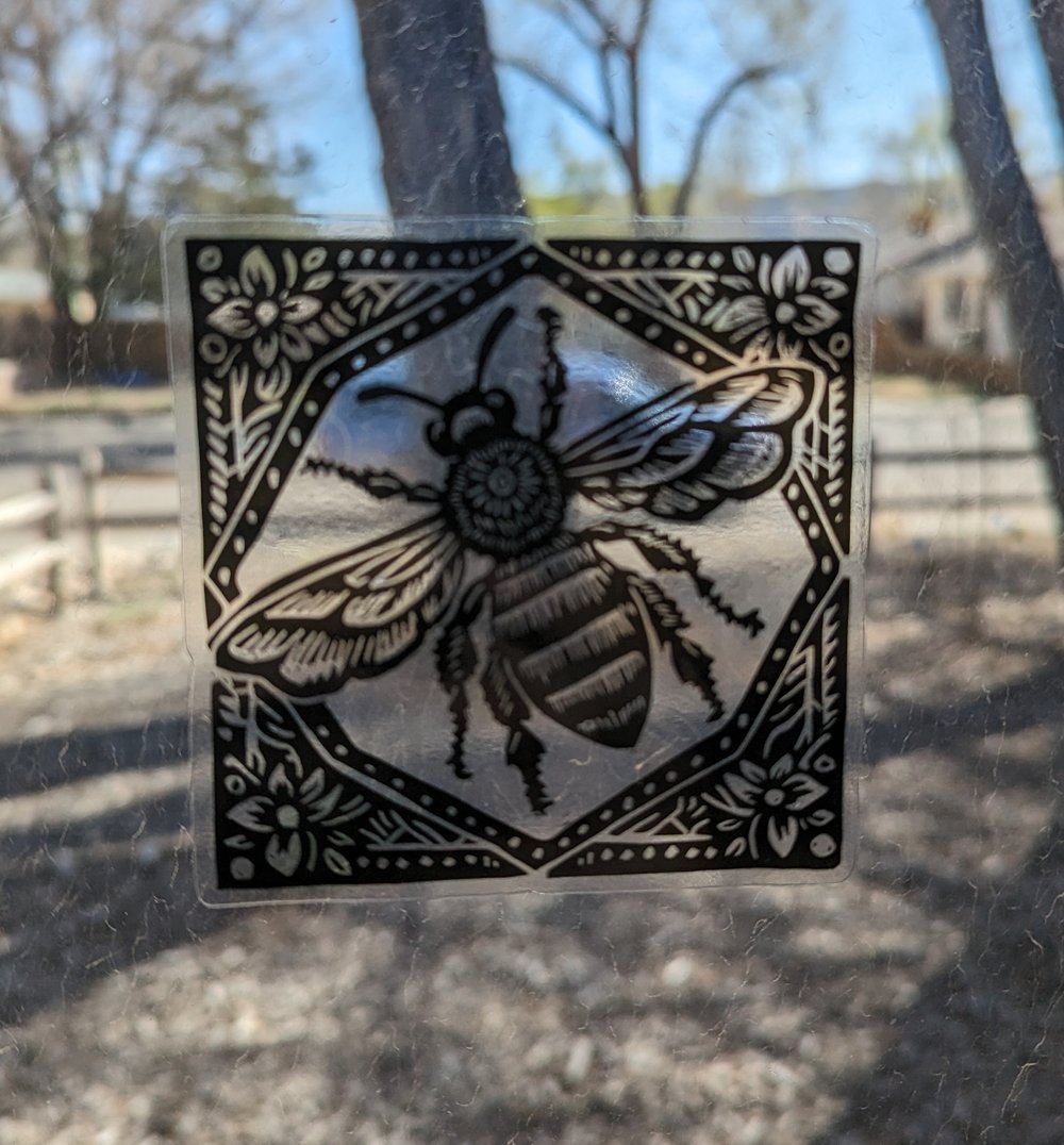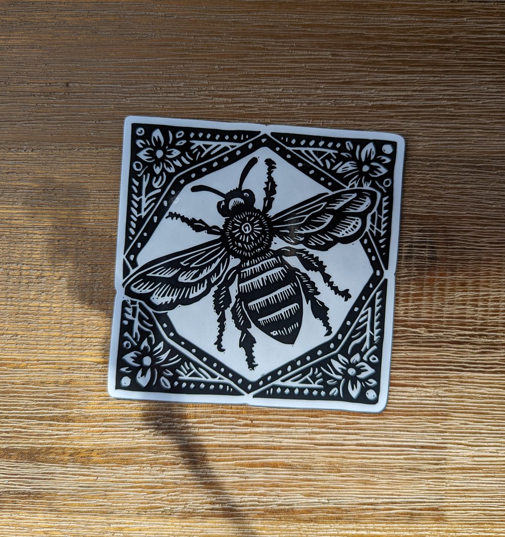 This sticker pictures a linocut bee with a flower pattern border. This sticker is transparent so anything white on the photo is clear an only the black shows.